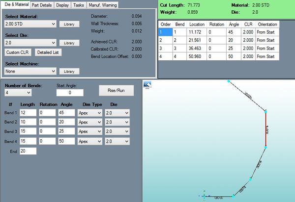 1. Once a proper die and material have been selected, the custom part design panel will be available to edit. First, the number of bends needs to be chosen. Select the drop down menu below "Number of Bends" and select "4" from the list.