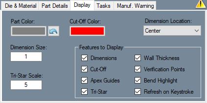 Under the "Display" tab, settings specific to the 3D part display can be adjusted. Select the button below "Cut-Off Color" to change the color that cut-off lengths will be displayed in. This button will display the current color that is in use. To change the size of the Tri-Star or Dimension text, enter values into either of the Tri-Star Scale or Dimension Size field.