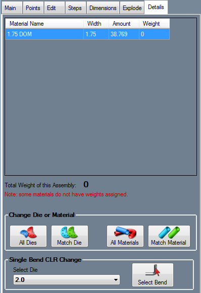 If weight per unit values have been given to the materials in the Tube/Pipe Library, the total weight of the assembly will be shown below the table.